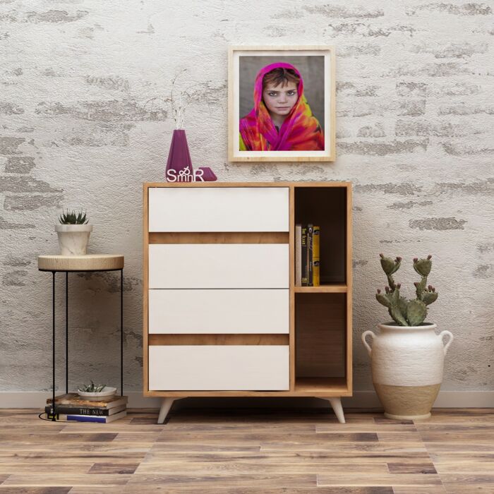 Die Kommode besteht aus 100% melaminbeschichteter Spannplatte mit einer Dicke von 18 mm. Sie hat eine Breite von 70 cm, eine Höhe von 86 cm und eine Tiefe von 40 cm.