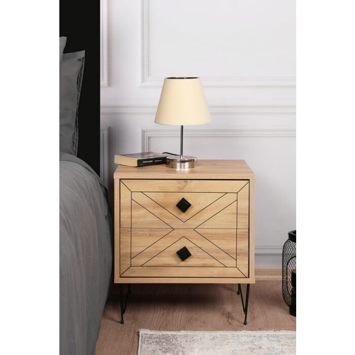 Der Nachttisch bietet mit seiner Melaminbeschichtung und einer Dicke von 18 mm eine robuste und langlebige Oberfläche. Die Metallbeine sorgen für stabilen Halt und ein modernes Design. Mit einer Breite von 50 cm, einer Höhe von 55 cm und einer Tiefe von 40 cm bietet er ausreichend Platz für Ihre Nachttischutensilien. Die 15 cm hohen Beine verleihen dem Nachttisch eine moderne Ausstrahlung. Die zwei geräumigen Schubladen mit einer Länge von 46 cm und einer Höhe von 17 cm bieten zusätzlichen Stauraum und organisieren Ihre persönlichen Gegenstände effizient.