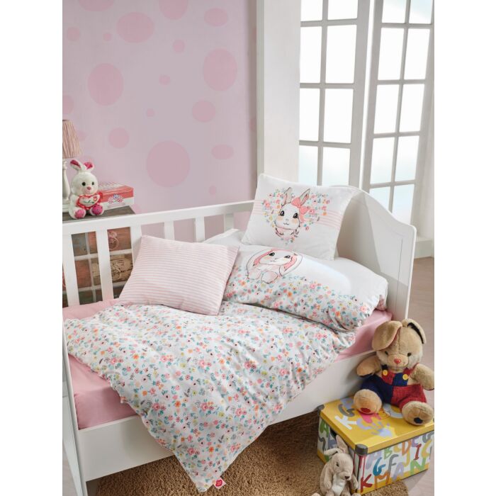Das Babybettbezug-Set besteht aus hochwertiger, reiner Baumwolle in Ranforce-Qualität. Der Bettbezug misst 100 x 150 cm, das Bettlaken 120 x 150 cm und die Kissenbezüge jeweils 35 x 45 cm.