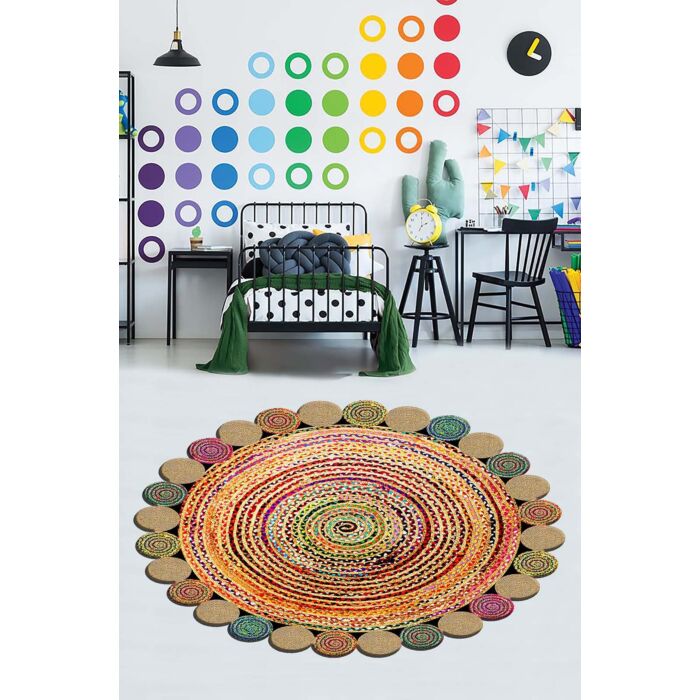 Der Teppich hat einen Durchmesser von 70 cm und besteht vollständig aus hochwertigem Polyester, das für seine Robustheit geschätzt wird. Mit einer Florhöhe von 8 mm und einem Gewicht von 850 g/m² sorgt das Material für einen luxuriösen Look und ein angenehmes Gehen.