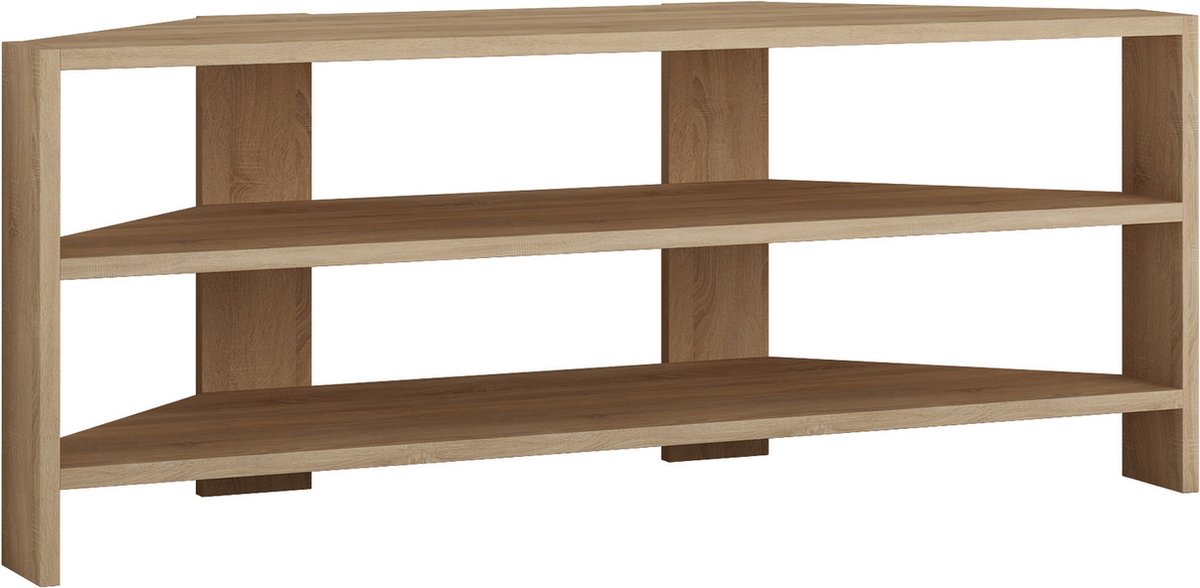 Dieser TV-Ständer ist 114 cm breit, 45 cm hoch und 36 cm tief. Die Regalhöhe beträgt 16 cm. Hergestellt aus 100% melaminbeschichteter Spanplatte in Eichenfarbe für ein elegantes und modernes Aussehen.