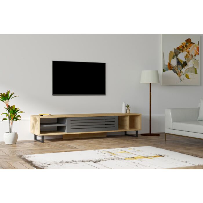 Das funktionale Design dieses TV-Ständers bietet reichlich Stauraum und Regale, um Ihre Geräte organisiert zu halten. Die Konstruktion aus melaminbeschichteter Spanplatte sorgt für Langlebigkeit und ein modernes Aussehen.