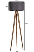 Die Holz-Stehlampe hat eine Gesamthöhe von 153 cm und einen Fußdurchmesser von 50 cm. Der Stoffschirm hat eine Länge von 24 cm und einen Durchmesser von 45 cm.