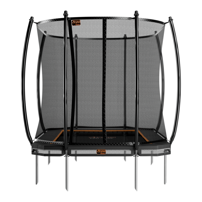 Das Avyna Pro-Line InGround-Trampolin mit Sicherheitsnetz in Schwarz ist Teil des Kombi-Sets und hat eine Größe von 3,40 x 2,40 Metern. Im Vergleich zu FlatLevel-Trampolinen erhebt es sich etwa 20 cm über den Boden. Dieses Trampolin ist mit einem Royal Class-Sicherheitsnetz, einem schwarzen Trampolinrand, doppelt verzinkten Federn und einem flexiblen Sprungtuch ausgestattet.