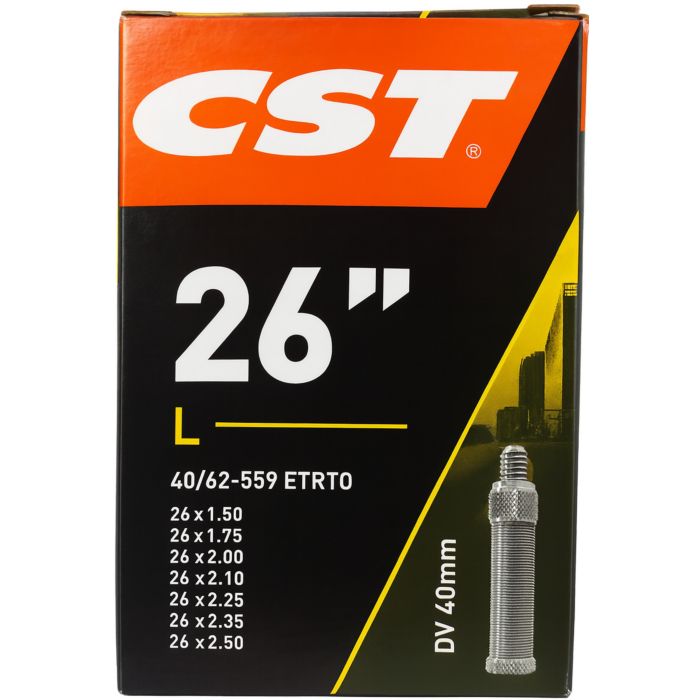 Die CST DV40 Innenband hat einen Durchmesser von 26 Zoll und ist in der Breite zwischen 1.50 und 2.50 Zoll konzipiert. Mit einer Ventillänge von 40 Millimetern passt sie perfekt in die meisten Felgen mit Blitz- oder Dunlop-Ventilen. Die Verwendung von strapazierfähigem Gummi gewährleistet Langlebigkeit und eine zuverlässige Abdichtung.