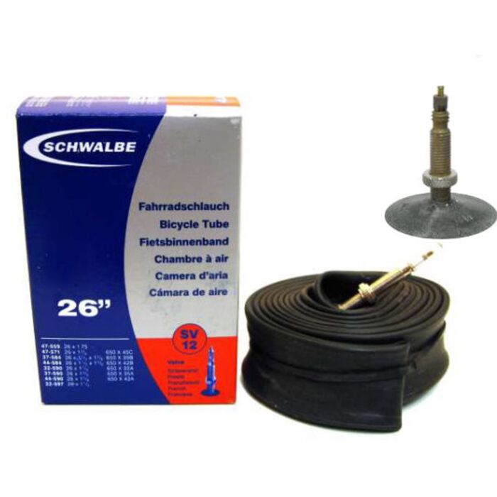 Die Schwalbe SV12 hat einen Durchmesser von 26 Zoll und ist für Reifen mit den Maßen 32/47-559 geeignet. Der enthaltene Ventiltyp bietet hervorragende Eigenschaften für die Verwendung an Fahrrädern, egal ob für den Stadtverkehr oder für längere Touren.