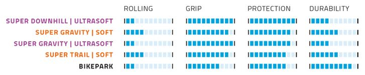 Das aggressive, offene Profildesign mit starken Schoudernoppen sorgt für maximale Bremskraft und Grip in Kurven, sogar auf matschigen Untergründen. Zusätzlich optimieren die speziellen V-Groves die Vertiefungen der Noppen mit der Oberfläche, was den Grip weiter verbessert. Die schrägen, flachen Noppen im Mittelbereich des Reifens optimieren das Fahrverhalten und machen jede Fahrt sicherer.