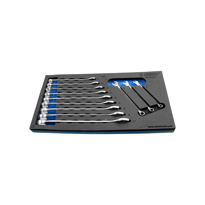 Das durchdachte Design des GRS Unior Inlay GW Ringsteckschlüsselsatzes präsentiert sich in einem praktischen langformatigen Aufbau, der für einfachen Zugang zu Schrauben und Muttern in schwer zugänglichen Bereichen sorgt. Jedes Werkzeug ist ergonomisch gestaltet, um den Einsatz zusätzlich komfortabel zu gestalten.