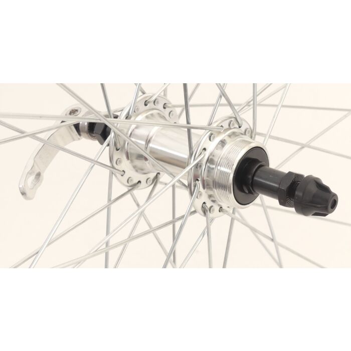 Der innovative Freilaufmechanismus sorgt für ein sanftes Fahrgefühl, während das ansprechende silberne Finish dem Fahrrad einen modernen Look verleiht. Mit dem praktischen Schnellspanner-System (QR) lässt sich das Rad schnell von Rahmen und Gabel abnehmen, was Reisen und Lagerung erleichtert.