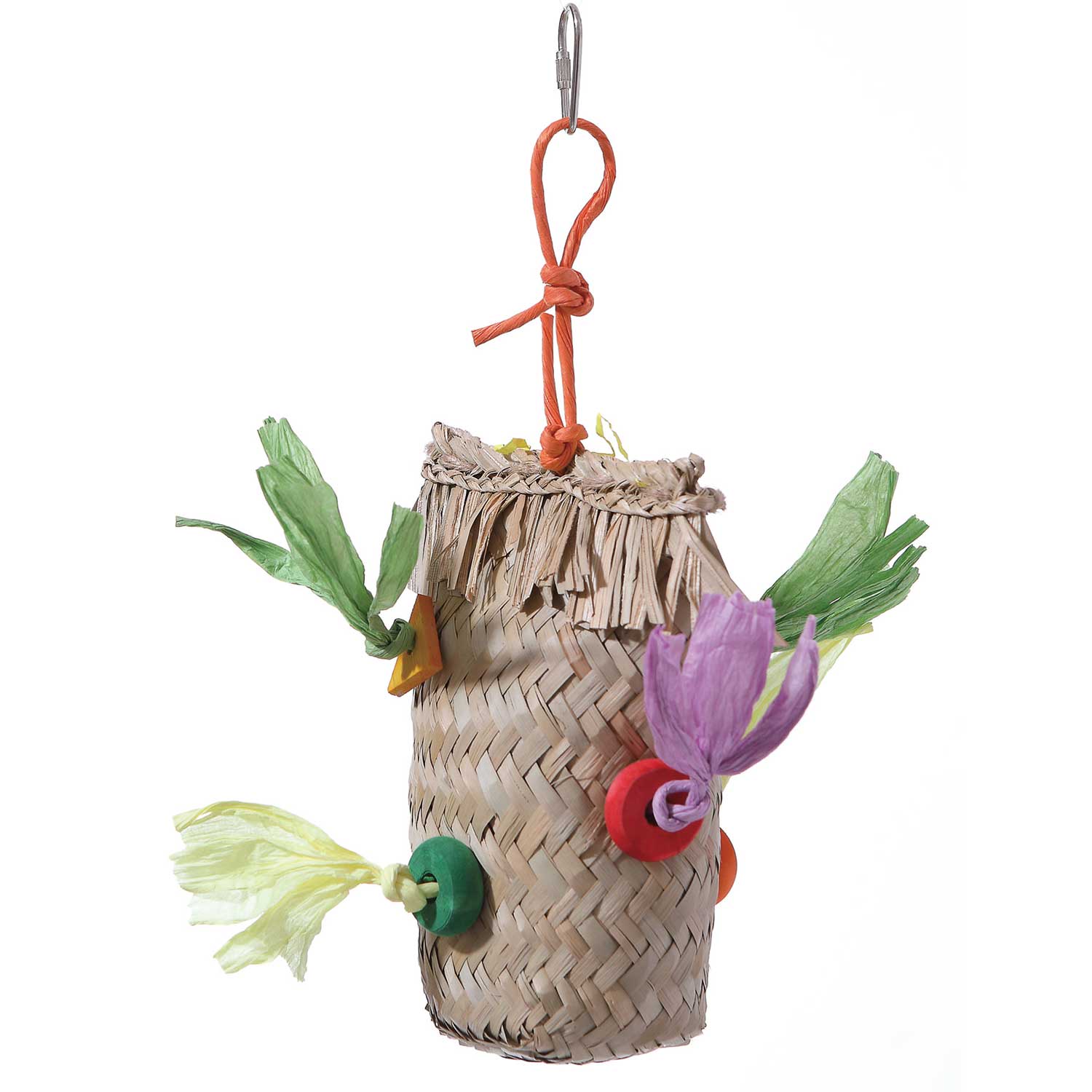 Die Tasche hat die Maße 26 x 12 cm und ist aus natürlichen Palmblättern gefertigt. Dieses umweltfreundliche Material ist weich und sicher für Vögel, während es gleichzeitig eine ansprechende Textur für das Spielvergnügen bietet.