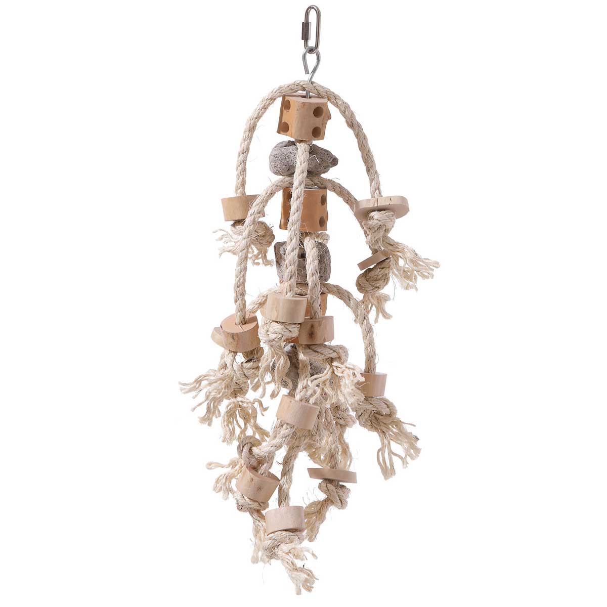 Der Hänger Maze misst 49 cm in der Höhe und 30 cm in der Breite und besteht aus natürlichen Materialien, darunter hochwertiges Kiefernholz, robusten Lavastein und weiche Baumwolle. Diese Materialien sind nicht nur sicher für Ihren Vogel, sondern verleihen dem Spielzeug auch eine ansprechende natürliche Optik.