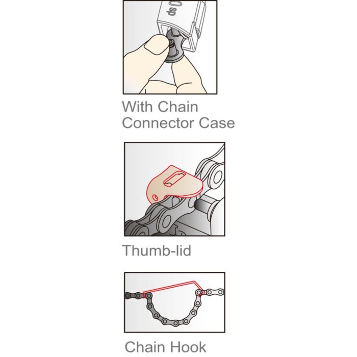 Das durchdachte Design der IceToolz Kettenpresse gewährleistet, dass die Kette während des Gebrauchs optimal gehalten wird. Eine integrierte Schutzkappe sorgt dafür, dass die Kette nicht abspringt, was die Anwendung sicherer macht. Darüber hinaus ermöglicht die Ketten-Demontagehilfe eine einfache und effiziente Kettenreparatur, ohne dass die Gefahr besteht, die Ketteninfrastruktur zu beschädigen.