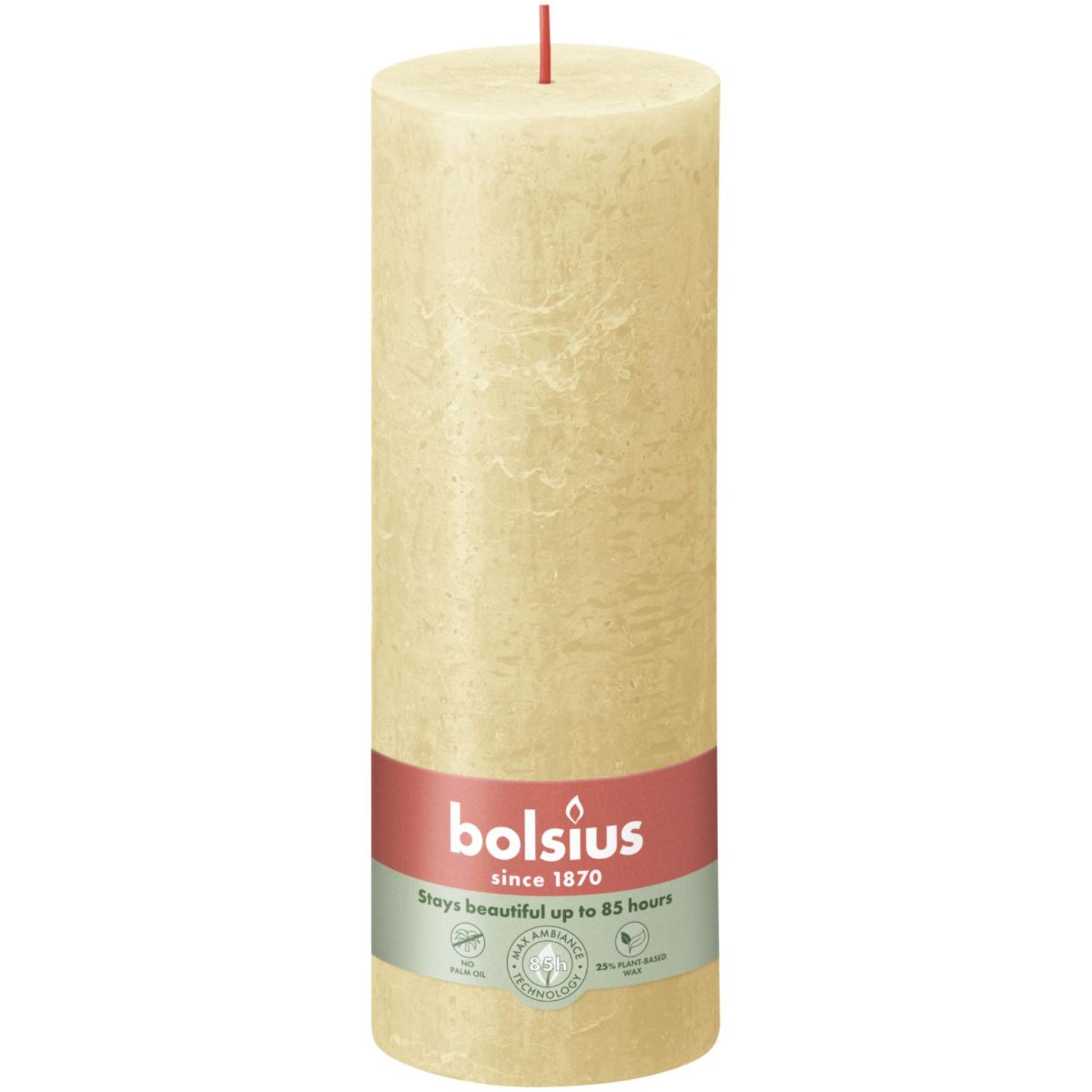 Die Bolsius Stumpenkerze misst 19 x 6,8 cm und besteht aus hochwertigem Wachs, das eine gleichmäßige und ruhige Brennqualität gewährleistet.