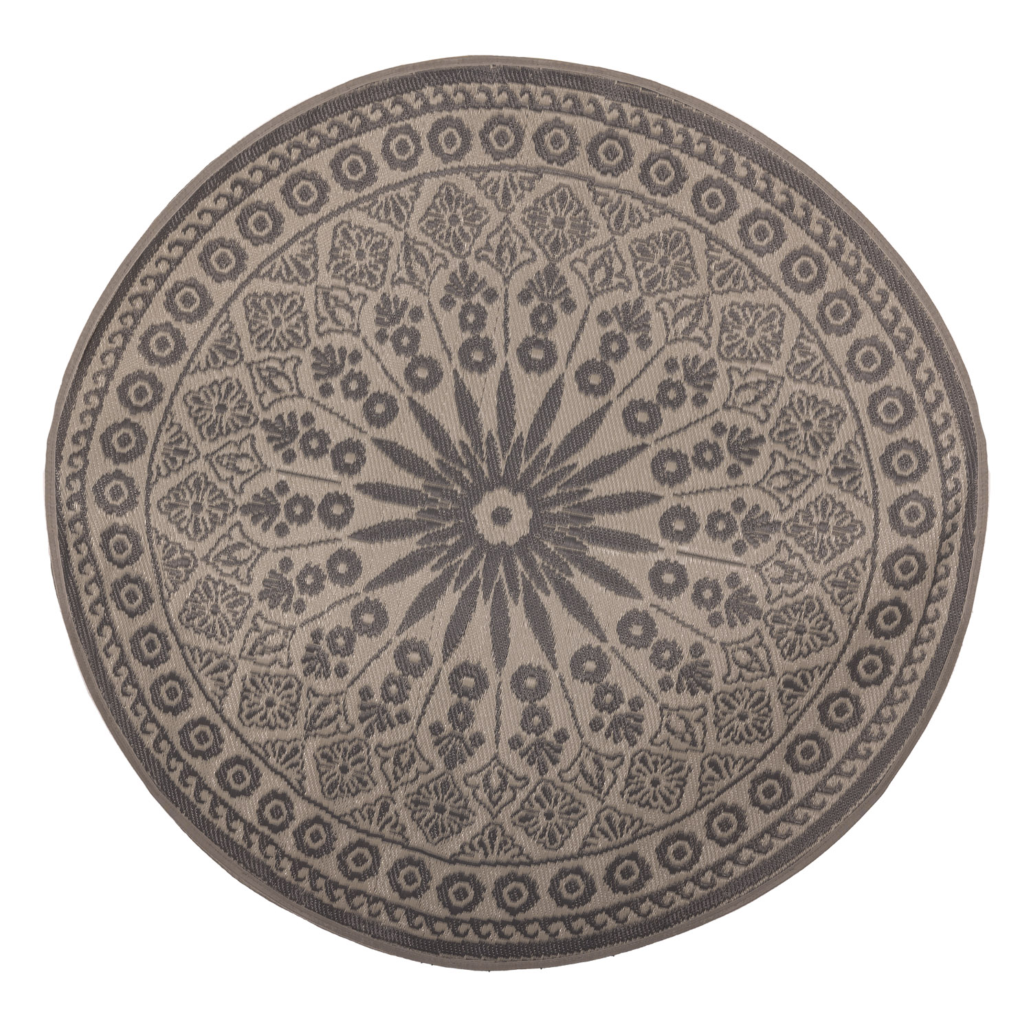 Der Teppich ist rund geschnitten und aus hochwertigem Material gefertigt, das sowohl langlebig als auch wetterbeständig ist.