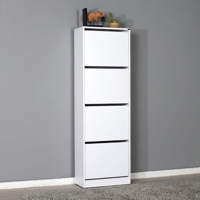 Mit 4 großzügigen Schubladen und zahlreichen Regalen bietet dieser Schrank vielseitige Aufbewahrungsmöglichkeiten für Ihre Schuhe und Accessoires. Sein klares Design passt perfekt in jeden Raum und kann auch an der Wand befestigt werden, um Platz zu sparen.
