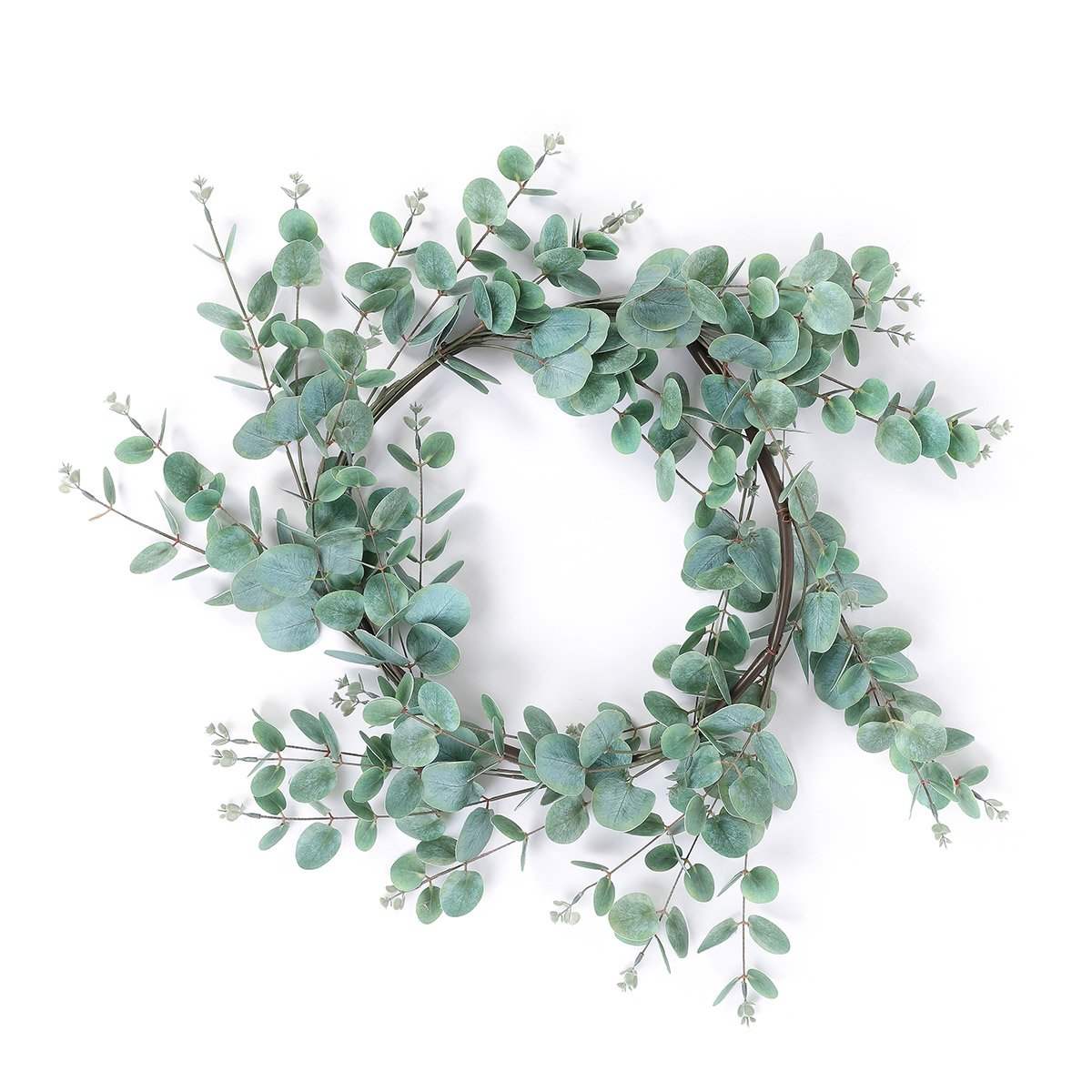 Der Eukalyptuskranz hat einen Durchmesser von 102 cm und besteht vollständig aus Kunststoff, der feuchtigkeitsbeständig und langlebig ist.