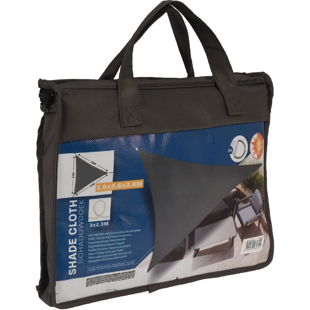 Das Schattendach in Grau mit den Abmessungen 360 x 360 x 360 cm bietet effektiven Schutz vor der Sonne in Ihrem Garten, auf der Terrasse oder beim Camping. Hergestellt aus hochwertigem 100% UV50+ Polyester garantiert es eine langanhaltende Nutzung bei allen Wetterbedingungen. Die 3 Zeilringe an den Ecken ermöglichen eine einfache und flexible Befestigung, während die 3 mitgelieferten Nylonseile vielfältige Befestigungsmöglichkeiten bieten. Das Schattendach wird in einer praktischen Plastiktragetasche geliefert, in der es leicht transportiert und aufbewahrt werden kann.