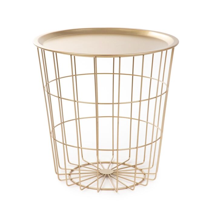 Die stilvolle HOMLA SCANDI Tafel ist in Form eines Korbes gestaltet und verfügt über eine runde Tischplatte. Sie fügt sich perfekt in die Einrichtung eines Wohnzimmers, Schlafzimmers oder Jugendzimmers ein. Die goldene Farbe verleiht Eleganz, während die schlichten Formen eine zeitlose Ästhetik gewährleisten. Das Tischblatt dient als Deckel, unter dem sich funktionale Stauraummöglichkeiten befinden.