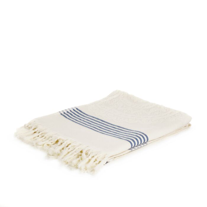 Wikkel jezelf in de HOMLA AMELI handdoek, die je huid warm houdt en zachtjes droogt van waterdruppels. Het katoenen oppervlak is versierd met een prachtig mandala-vormig motief, dat samen met de subtiele ecru kleur een element van rust en harmonie in de badkamer brengt. Extra decoratie wordt geboden door blauwe strepen en kwastjes, die een vleugje boho aan de handdoek toevoegen. Perfect absorberend en aangenaam voor de huid, dus ideaal voor dagelijks gebruik na een bad.
