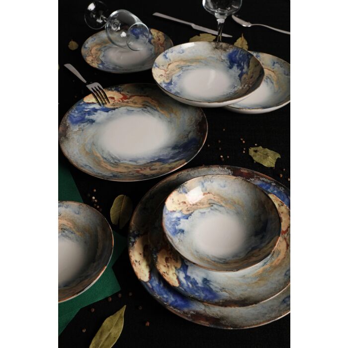 Das Set umfasst 6 Servierplatten mit den Abmessungen 25 x 25 x 2 cm, 6 Speiseteller (20 x 20 x 4 cm), 6 Schalen (15 x 15 x 4,5 cm / 250 cc) und 6 Dessertteller (20 x 20 x 2 cm). Alle Teile sind aus 100% hochwertigem Porzellan gefertigt, was ihnen eine zeitlose Eleganz verleiht. Die Kombination der Farben Weiß, Blau und Gold bringt das gewisse Etwas auf Ihre Tischdekoration.