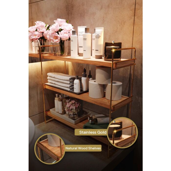 Die Planke kombiniert Ästhetik mit Funktionalität. Unterstützt durch robuste metallische Halterungen bietet sie eine außerordentliche Stabilität. Das beeindruckende Design vereint goldene und braune Töne, die sich harmonisch in verschiedene Einrichtungsstile einfügen.