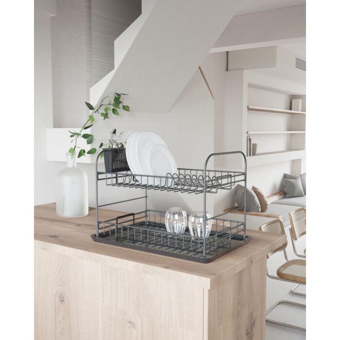 Mit seinen Abmessungen von 47 x 32 x 31 cm bietet unser Afdruiprek ausreichend Platz für all Ihre Teller, Küchengeräte und sogar Töpfe und Pfannen. Das intelligente Design besteht aus zwei Teilen, sodass Sie die Anordnung perfekt an den Grundriss Ihrer Küche anpassen können. Verabschieden Sie sich von überfüllten Trockenregalen und heißen Sie einen gut organisierten Raum willkommen.