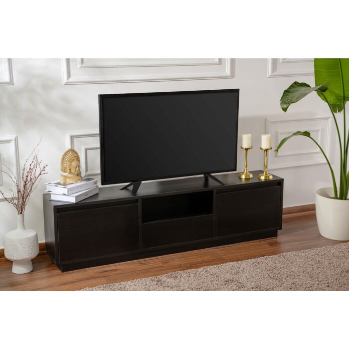 Der TV-Ständer hat eine Breite von 160 cm, eine Höhe von 42 cm und eine Tiefe von 29,5 cm. Hergestellt aus hochwertigem 100% gemelaminierter Spanplatte sorgt dieser Ständer für die nötige Stabilität und Langlebigkeit. Die Dicke von 18 mm stellt sicher, dass das Möbelstück robust ist und auch über Jahre hinweg eine solide Basis für Ihren Fernseher bietet. Die schwarze Holzoberfläche fügt sich nahtlos in jedes moderne Interieur ein.