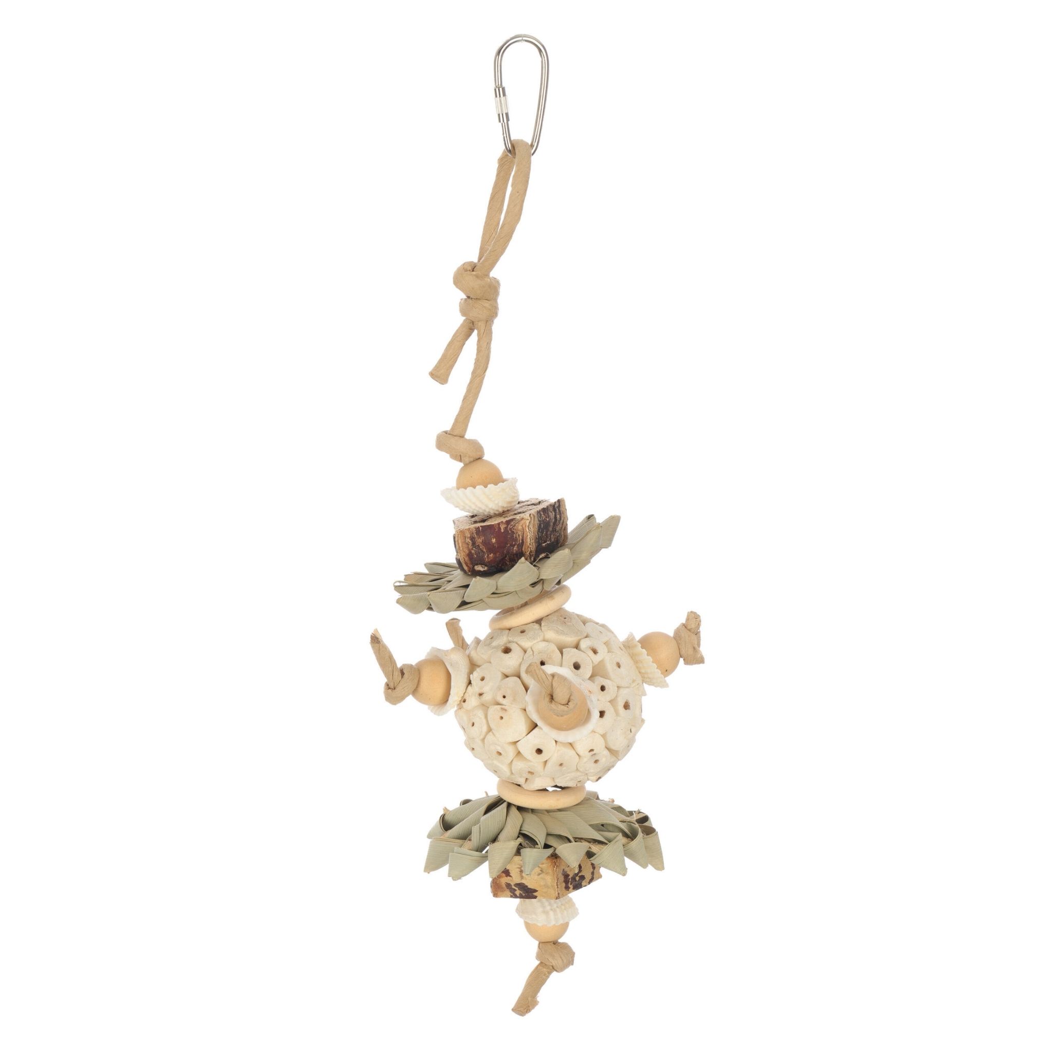 Geben Sie Ihrem Papagei eine herausfordernde und verantwortungsvolle Spielmöglichkeit mit dem QUAPAS! Papegaaienspeelgoed Nature. Dieses Spielzeug besteht vollständig aus natürlichen Materialien wie Papiercord, Kiefernholz, Sola-Holz, Mahagonischote und Palmblatt. Dank der Variation der Texturen bleibt Ihr Vogel aktiv und angeregt.
