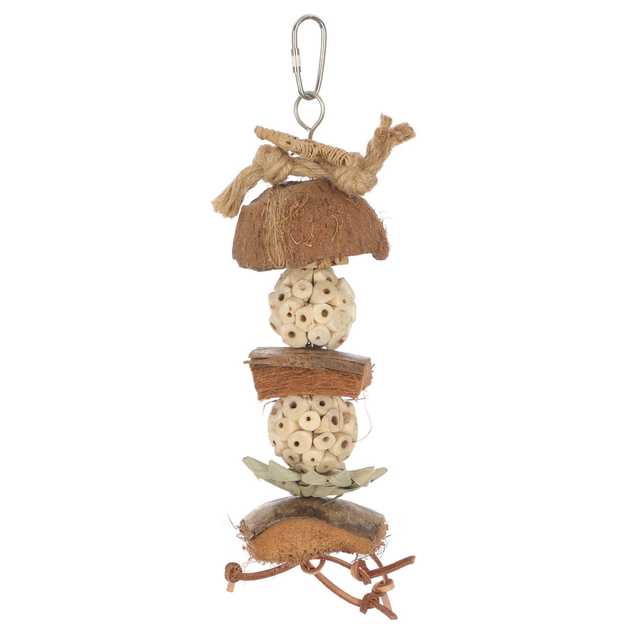 Das Design des Spielzeugs fördert die Interaktion und Beschäftigung. Papageien können auf den Kokosnusschalen beißen, am Juteseil ziehen oder die Palmblätter erkunden. Diese Vielfalt sorgt dafür, dass Ihr Vogel ständig etwas Neues entdeckt und somit aktiv und glücklich bleibt.