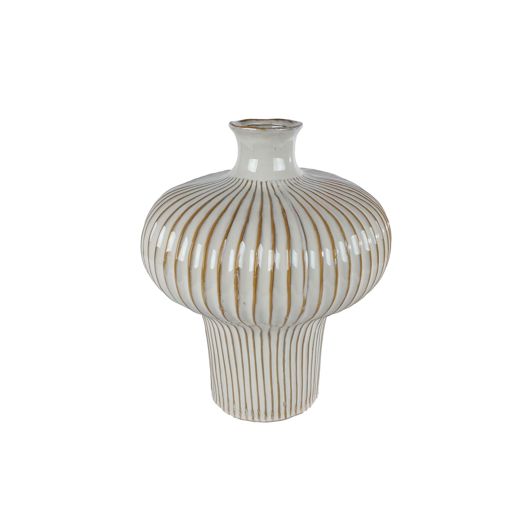 Die Vaas Jodie L in Weiß/Braun ist ein stilvolles Dekorationselement für jedes moderne Zuhause. Mit ihren kompakten Abmessungen von 31x31x35,5 cm bietet sie genug Platz für verschiedene Blumenarrangements und bringt eine elegante Note in jeden Raum.