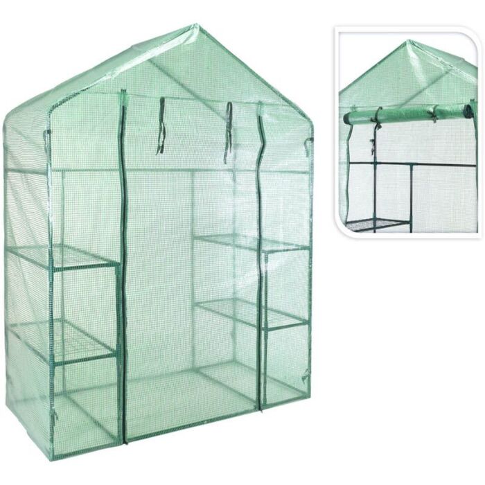 Diese walk-in Broeikas ist mit einer innovativen Doppelreißverschlussöffnung ausgestattet, die den Zugang zu den Pflanzen erleichtert. Die Hülle kann einfach aufgerollt und fixiert werden, um eine flexible Nutzung zu ermöglichen. Das Design mit vier Metallrosten gewährleistet eine optimale Unterstützung für Ihre Pflanzen.