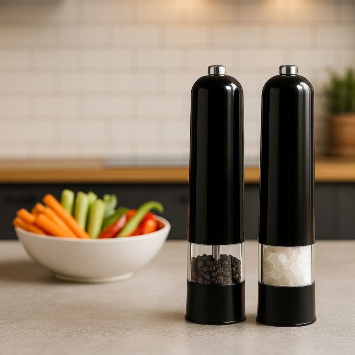 Die Ceruzo elektrische Peper- und Zoutmolen Set bietet eine praktische und elegante Lösung für die würzige Verfeinerung Ihrer Speisen. Diese Set besteht aus zwei hochwertigen Mühlen, die ergonomisch gestaltet sind, um Ihnen das Mahlen von Gewürzen mühelos und effektiv zu ermöglichen.
