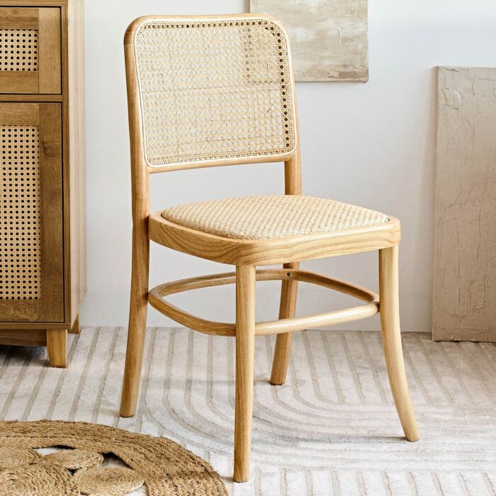 Der Rahmen des Stuhls besteht aus massivem Holz, was eine stabile Konstruktion gewährleistet. Für die Rückenlehne und Sitzfläche haben wir Rattan verwendet, das das Erscheinungsbild der Möbel wunderbar ergänzt.