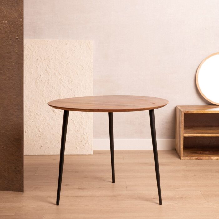Der Tisch misst 60x60x40 cm und hat eine Tischplatte aus Akazienholz, das für seine Langlebigkeit und natürlichen Details bekannt ist. Die Metallbeine sorgen für Stabilität, während das Gesamtbild sowohl ansprechend als auch pflegeleicht ist.