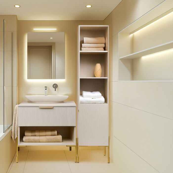 Gestalten Sie das Badezimmer Ihrer Träume, in dem jeder Zentimeter Raum optimal genutzt wird und gleichzeitig ein elegantes sowie stilvolles Ambiente entsteht. Dank einer durchdachten Anordnung wird Ihr tägliches Schönheitsritual sowie der entspannende Moment beim Baden zu einem echten Vergnügen. Diese Harmonie erreichen Sie durch die Wahl des NAVADO Badschranks in der modischsten Farbe Cashmere.