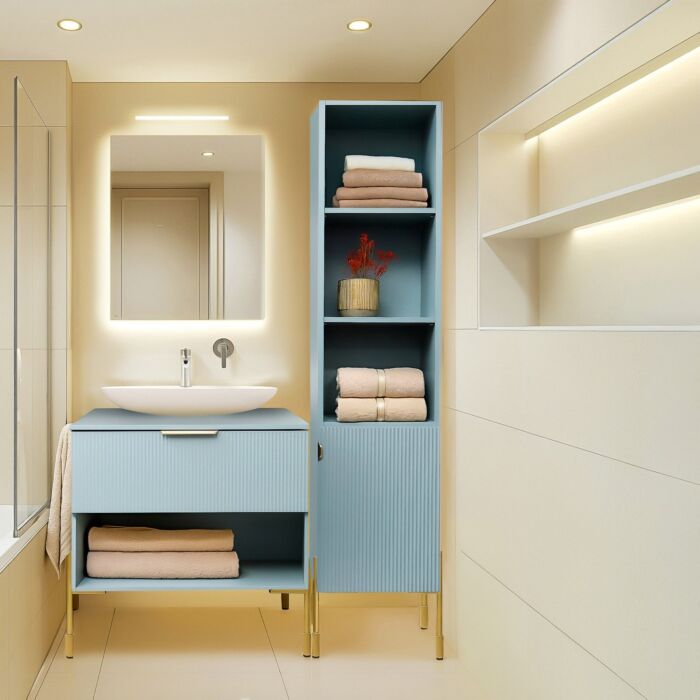 Der NAVADO-Schrank, auch Säule genannt, bietet viel Stauraum, ohne wertvollen Platz in Anspruch zu nehmen. Er ist mit drei offenen Regalen und einem geräumigen, abschließbaren Schrank ausgestattet. Sie können Kosmetika, Handtücher und Badezimmerzubehör darin aufbewahren. Die offenen Regale eignen sich ideal für die Präsentation dekorativer Gegenstände wie schön gefaltete oder gerollte Handtücher, dekorative Behälter, Duftkerzen oder Pflanzen, während das abschließbare Regal mit gefräster Front einen diskreten Platz für weniger ansprechende, aber notwendige Artikel bietet.