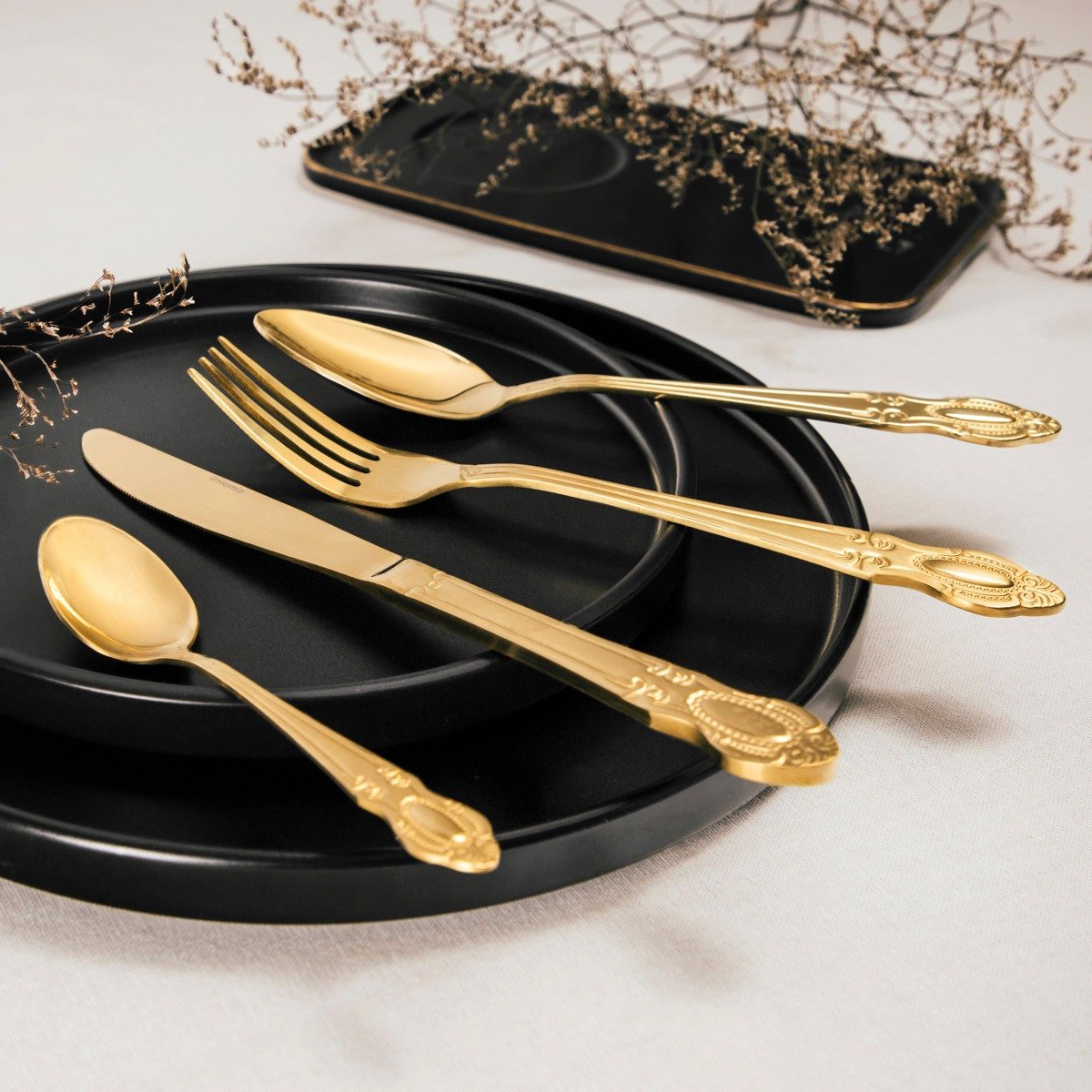 Das 24-teilige Besteckset ist ideal für Ihre Küche und Ihr Esszimmer. Es sieht sowohl bei alltäglichen Mahlzeiten als auch bei großen Feierlichkeiten hervorragend aus. Das goldene Besteck ist ein einzigartiges Stück Geschirr, das sicher die Aufmerksamkeit Ihrer Gäste auf sich ziehen wird.