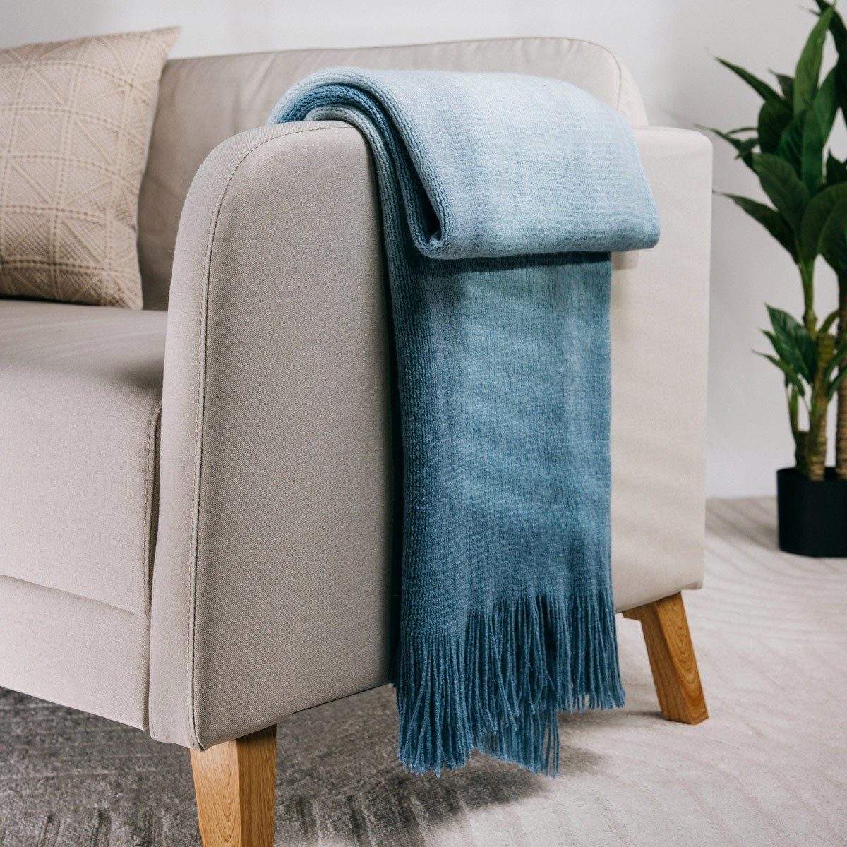 Die FINNS-Decke besticht durch ihr elegantes Ombre-Design in sanften Blautönen sowie feinen Fransen, die einen stilvollen Akzent in jedem Raum setzen. Sie passt hervorragend zu verschiedenen Einrichtungsstilen und verleiht Ihrem Zuhause einen Hauch von Eleganz.
