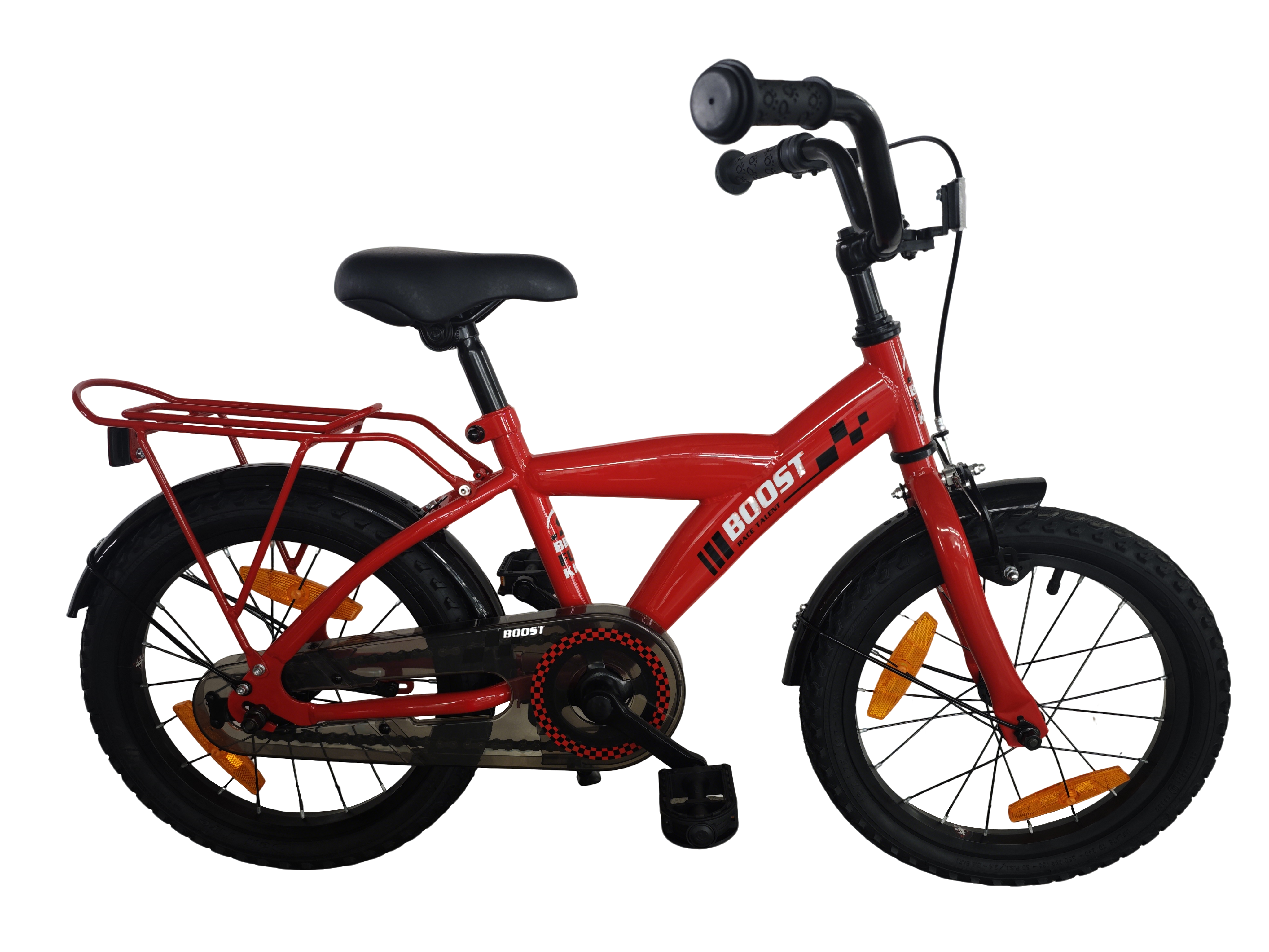 Die Bikefun Boost 16 Zoll ist ein sportliches Kinderfahrrad in einem auffälligen roten Design, ideal für Kinder im Alter von etwa 4 bis 6 Jahren. Diese Fahrrad kombiniert eine robuste Erscheinung mit praktischer Funktionalität und ist perfekt für junge Radfahrer, die bereit sind für mehr Selbstständigkeit und Abenteuer. Mit ihrem stabilen Stahlrahmen, einem geschlossenen Kettenkasten und sowohl Rücktritt- als auch Handbremse gewährleistet dieses Fahrrad optimale Sicherheit. Der Gepäckträger und die Reflektoren machen es zudem extra praktisch und gut sichtbar im Verkehr.