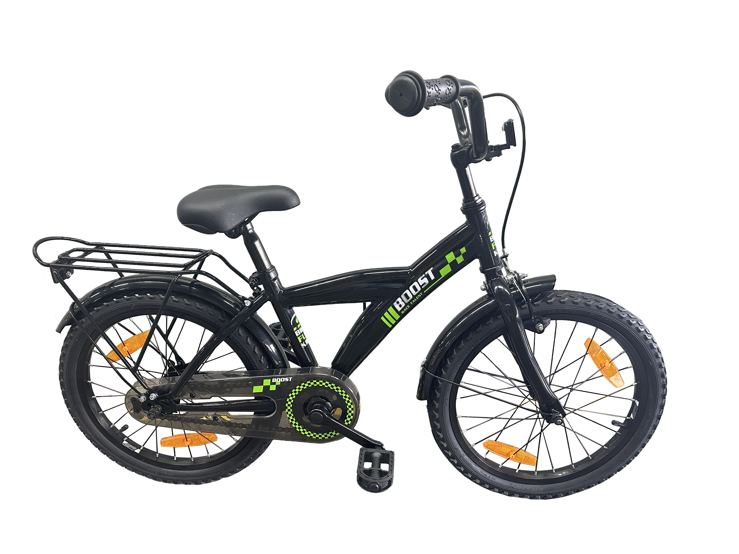 Die Bikefun Boost 18 Zoll ist ein robuster Jungenfahrrad in sportlicher schwarzer Ausführung mit auffälligen grünen Renndetails. Diese Fahrrad ist ideal für Kinder im Alter von etwa 5 bis 7 Jahren, die bereits selbstständig fahren können und bereit für den nächsten Schritt sind. Der stabile Stahlrahmen und die sichere Verarbeitung machen dieses Fahrrad perfekt für den täglichen Gebrauch und Abenteuer in der Nachbarschaft.