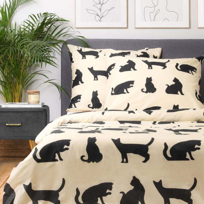 Das Set umfasst einen Bettbezug in der Größe 160 x 200 cm sowie einen Kissenbezug von 70 x 80 cm. Verschiedene Katzen in Schwarz sind auf einem beigen Hintergrund platziert. Die beige-schwarze Farbgebung macht die Bettwäsche sehr vielseitig und passend für viele Einrichtungsstile.