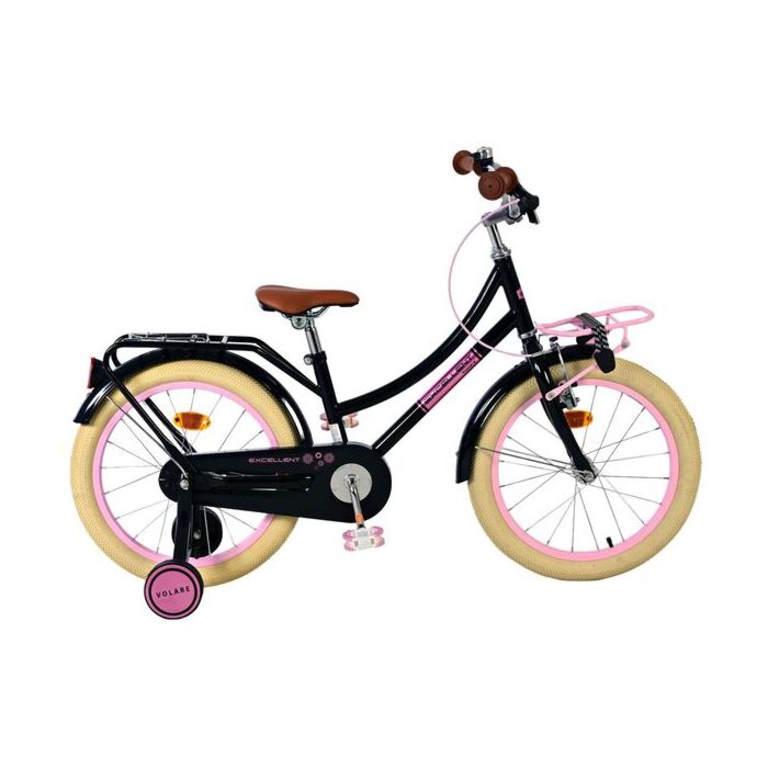 Das Volare Excellent Kinderfahrrad hat eine Größe von 18 Zoll, was es ideal für kleine Fahrer macht. Der Rahmen ist stabil und robust, das Design ist ansprechend in Schwarz gehalten.