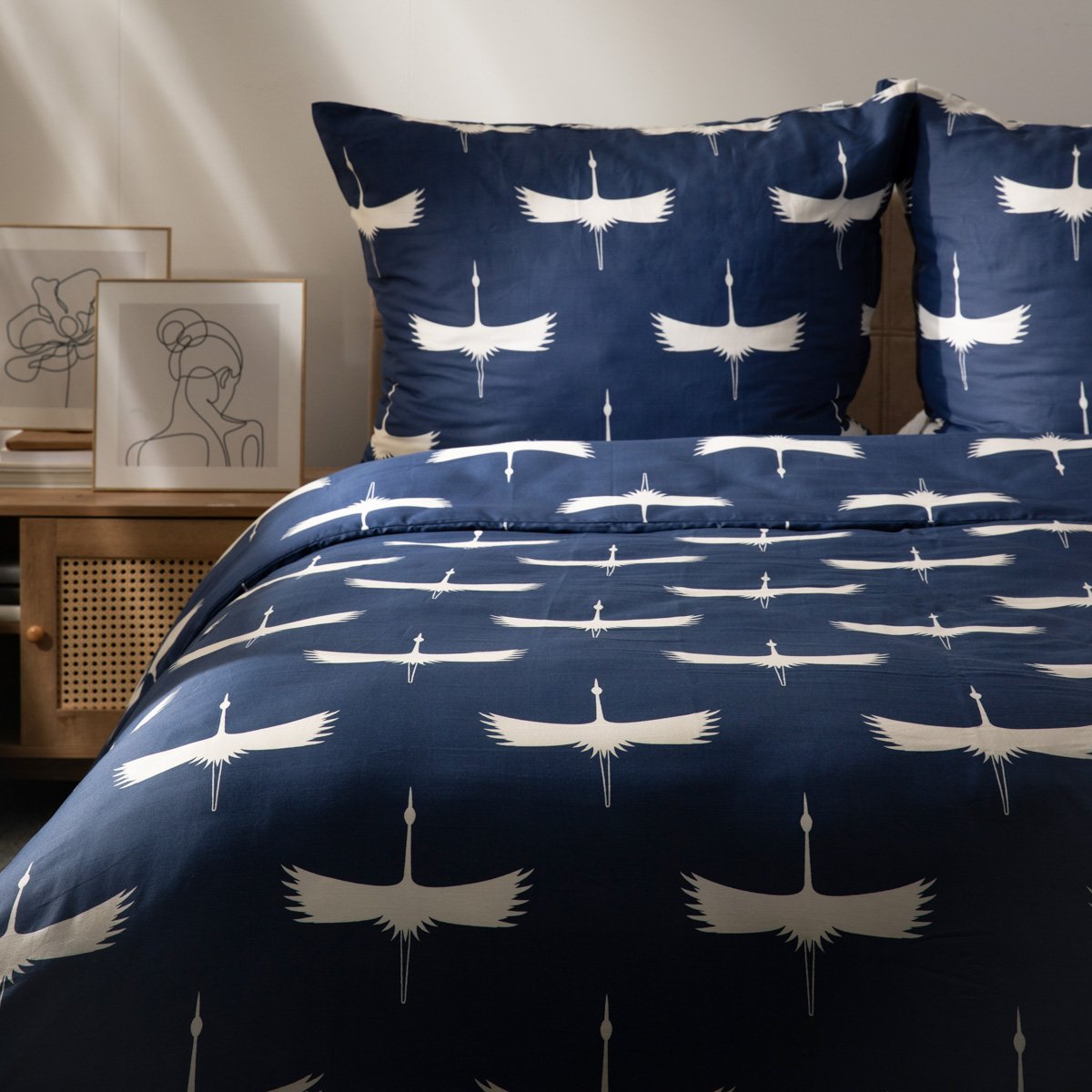 Das subtile Motiv von Kranichen mit ausgebreiteten Flügeln auf dem tiefblauen Hintergrund verleiht dem Interieur eine besondere Note, während es äußerst vielseitig bleibt. Es ist eine hervorragende Wahl für Schlafzimmer im skandinavischen, modernen, japanischen und fernöstlichen Stil.