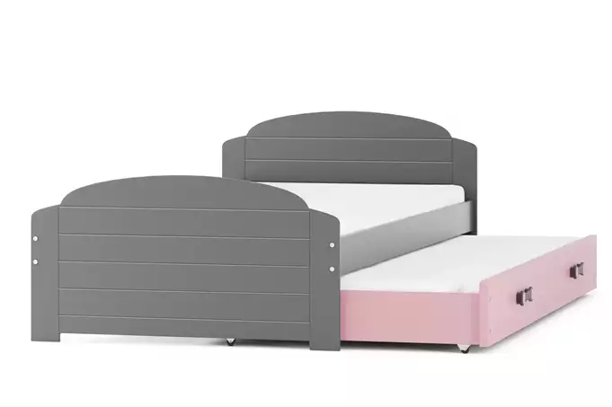Das Bett hat die Standardgröße von 90x200 cm. Der Bettrahmen ist aus robustem Kiefernholz hergestellt und mit einer langlebigen, wasserbasierten Farbe lackiert, die für eine gesunde Raumluft sorgt. Die Matratzen bestehen aus hochwertigem Klimafaser- und Polyurethan-Schaum, während der Bezug aus hypoallergenem, quilted Polyesterstoff gefertigt ist. Die Schublade ist aus stabiler Spanplatte und bietet zusätzlich eine Schlafmöglichkeit.