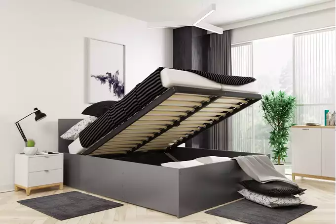 Das BMS Bett in der Größe 160x200 cm bietet optimalen Komfort und Stauraum in einem modernen Graphit-Finish. Die Konstruktion aus hochwertigem laminierten Holz erhöht die Langlebigkeit und sorgt für eine einfache Pflege. Dank des durchdachten Designs ist der hintere Bereich unter dem Bett ohne Bodenplatte, sodass der Stauraum ausschließlich an der Vorderseite des Bettes genutzt wird.