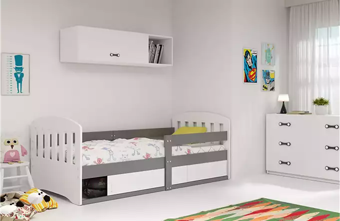 Dieses Bett liefert nicht nur Schlafkomfort, sondern bietet auch eine praktische Lösung für die Aufbewahrung von Spielzeug und anderen Gegenständen. Die Fronten sind mit einem PVC-Griff ausgestattet, der das Öffnen erleichtert. Zudem wird eine maximale Tragfähigkeit von bis zu 100 kg gewährleistet. Die abgerundeten Kanten der Struktur gewährleisten erhöhte Sicherheit für die Kleinen.