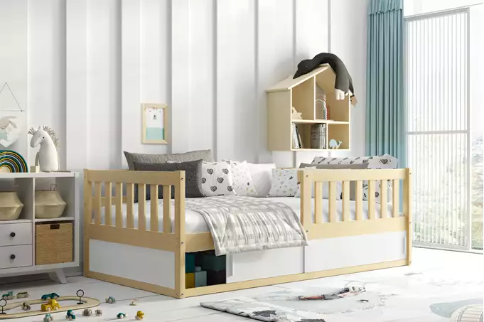 Dieses Bett überzeugt durch seine Funktionalität mit einem durchdachten Stauraum unter dem Bett, der ideal für Spielsachen oder Bettwäsche ist. Die runden Kanten (Radius R2) sorgen für zusätzliche Sicherheit und verhindern Verletzungen. Die PVC-Griffe erleichtern das Öffnen und Schließen des Stauraums.