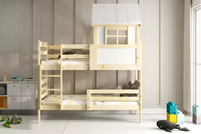BMS | Bunk House Bett mit Dach | Eryk aus natürlichem Holz 90x190 mit Matratze