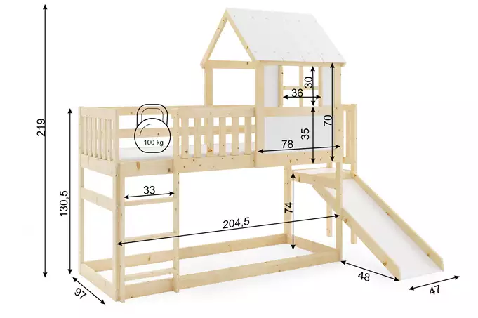 Das Hochbett hat eine Standardgröße von 90x200 cm und wird aus hochwertigem, unbehandeltem Kiefernholz gefertigt. Die Matratze hat die Größe 200x90 cm und besteht aus hypoallergenem, gequiltetem Material, das sowohl Komfort als auch Sicherheit bietet. Die rundum abgerundeten Kanten minimieren das Risiko von Verletzungen.