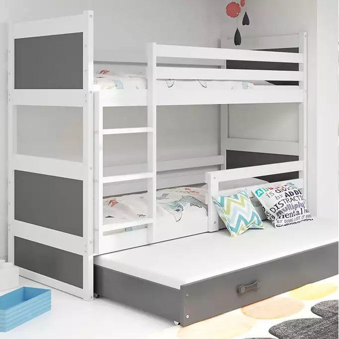 Das BMS RICO Triple Jugendbett in der Größe 90x200 cm verbindet praktisches Design mit hochwertiger Verarbeitung. Der Rahmen besteht aus robustem Kiefernholz, das mit einer umweltfreundlichen, wasserbasierten Lackierung behandelt wurde, was nicht nur für eine ansprechende Optik sorgt, sondern auch die Langlebigkeit des Bettes erhöht. Mit seinem modernen, klaren Design wird dieses Bett sowohl funktional als auch stilvoll in das Zimmer Ihres Kindes integriert.